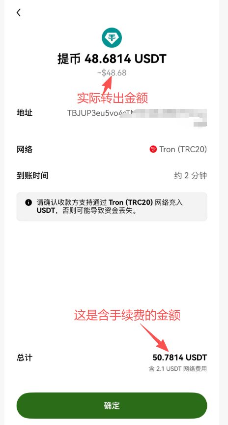 - 提现网络: 必须选择 Tron(TRC20)。